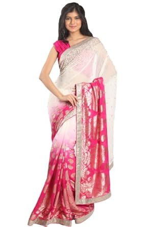 Off-white and Deep Cerise Pink embroidered party saree intricate with zari thread, sequins work, keri work, floral work and patch patti border work.Saree comes with an unstitch blouse piece which can be customised as per your requirement. Customisation includes changing front neck style, back neck style, increasing/reducing the length of sleeves.Accessories which is shown in the image is only for shooting purpose.There might be some color variation.Time to deliver: 7 days.