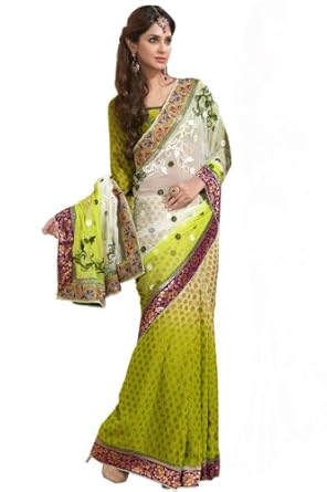 Off-white and Yellow-green embroidered party saree intricate with resham thread, zari thread, floral work, sequins and patch patti border work.Saree comes with an unstitch blouse piece which can be customised as per your requirement. Customisation includes changing front neck style, back neck style, increasing/reducing the length of sleeves.Accessories which is shown in the image is only for shooting purpose.There might be some color variation.Time to deliver: 25 days.