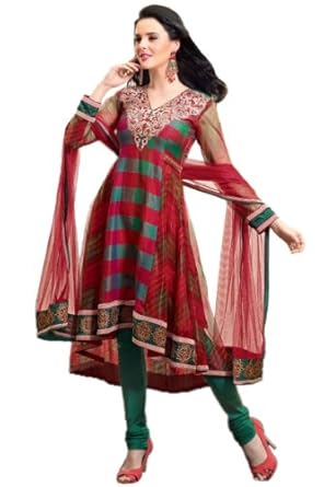Rose-madder Red and Sea Green embroidered party anarkali kameez intricate with zari thread, floral work, neck work, square print and patch patti border work.This anarkali kameez is unstitch and length of kameez can be stitched upto size 42. Customisation includes changing front neck style, back neck style, increasing/reducing the length of sleeves.Accessories which is shown in the image is only for shooting purpose.There might be some color variation.Time to deliver: 25 days.