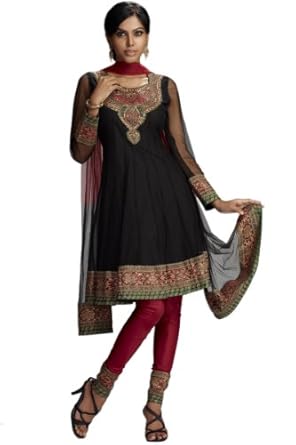 A spicy flavor! This is a traditional festival-wear in a Black and Cardinal Red cotton anarkali salwar kameez with sequins, beads, dabka, gold print, neck work and brocade patch patti border work.This stich fabric is coupled with match dupatta and churidar customize till upto size 44.There might be some color variation.Time to deliver: 7 days.